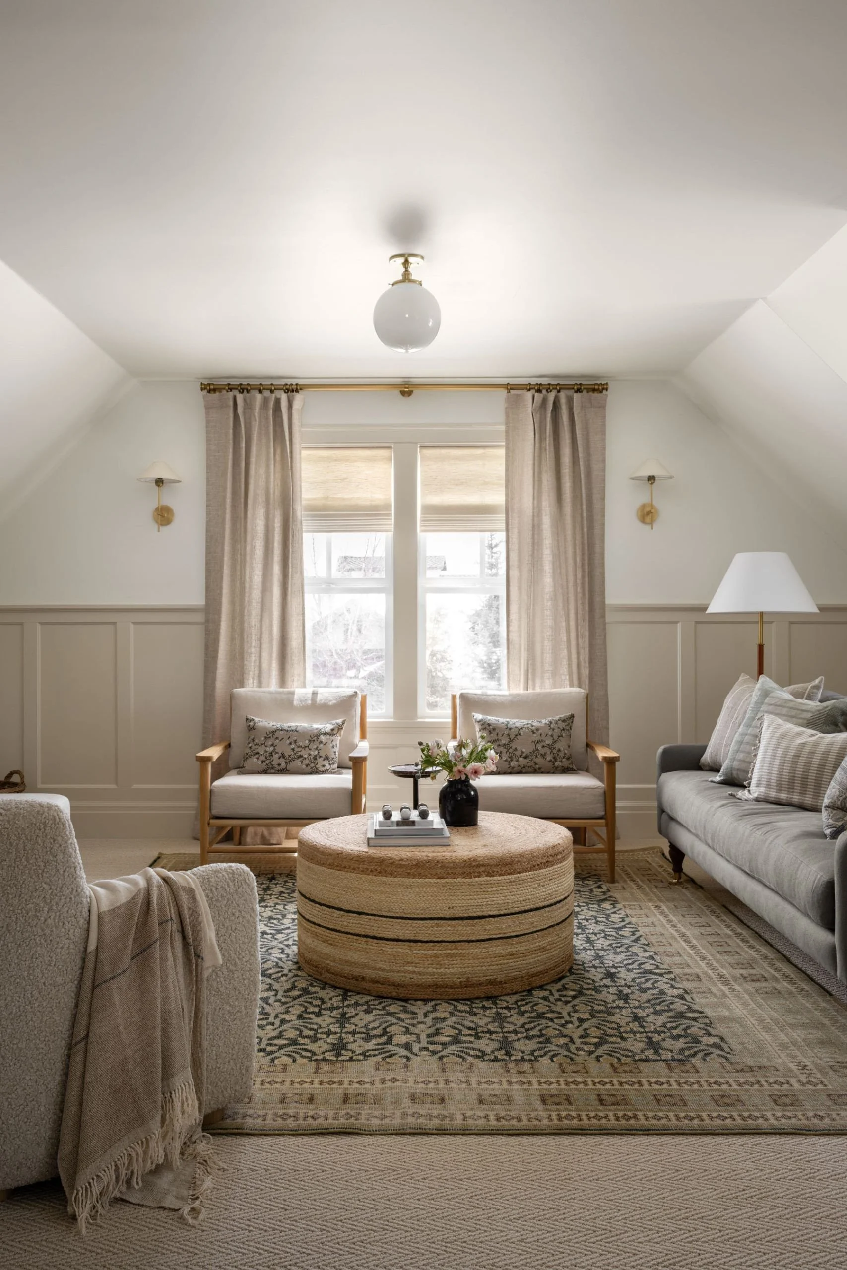 Design Tip: Since the ceiling in the attic is likely lower, avoid low-hanging light fixtures and instead use a mixture of table lamps and floor lamps!