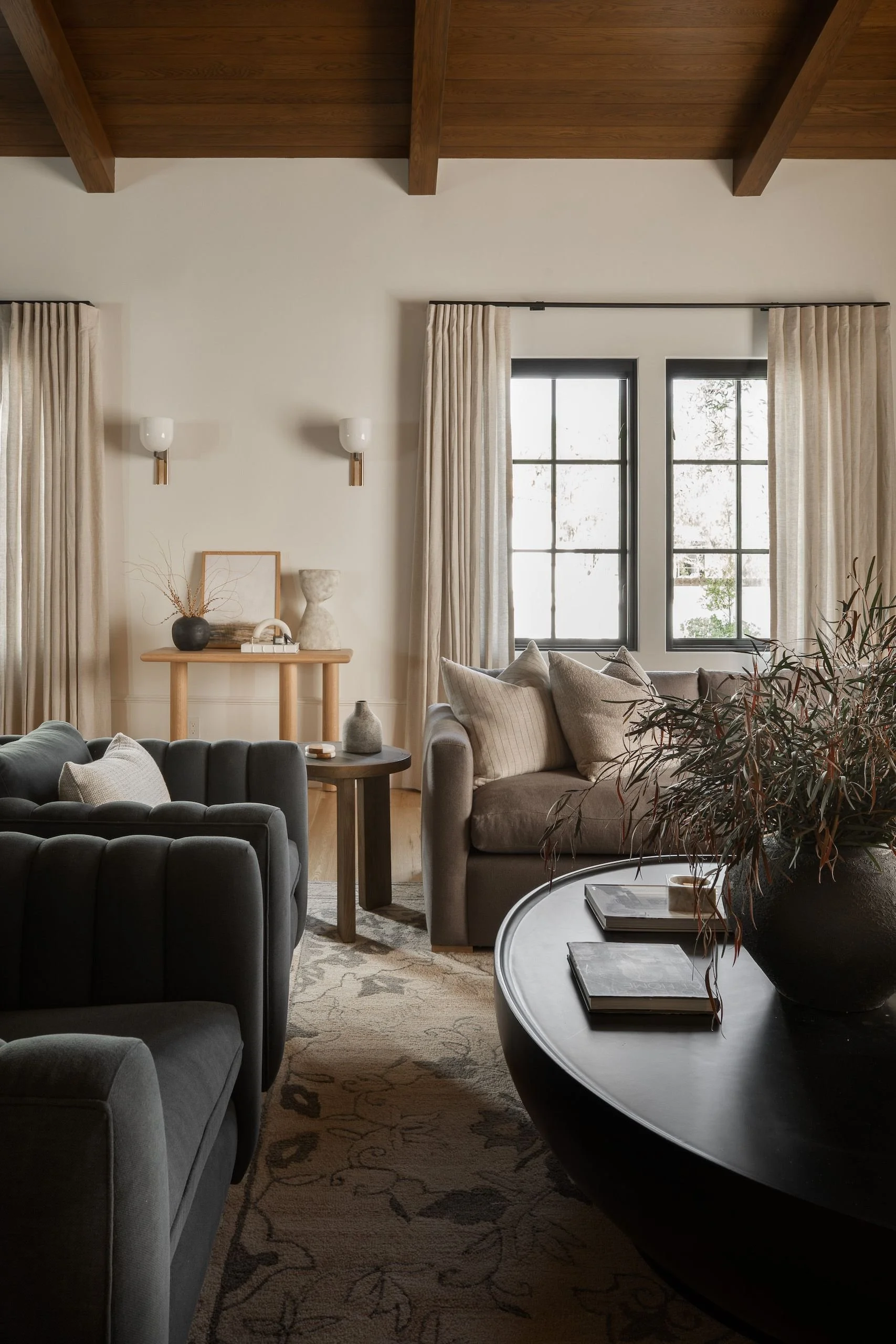 Wood never goes out of style. Whether you’re into contemporary, traditional, or mid-century modern designs, there is always a place for wood. To really get that cocoon-like feeling, consider adding a ceiling treatment or built-ins. Wooden legs on your furniture pieces are also a nice touch! Mid-tone wood is having a big comeback and we love it!